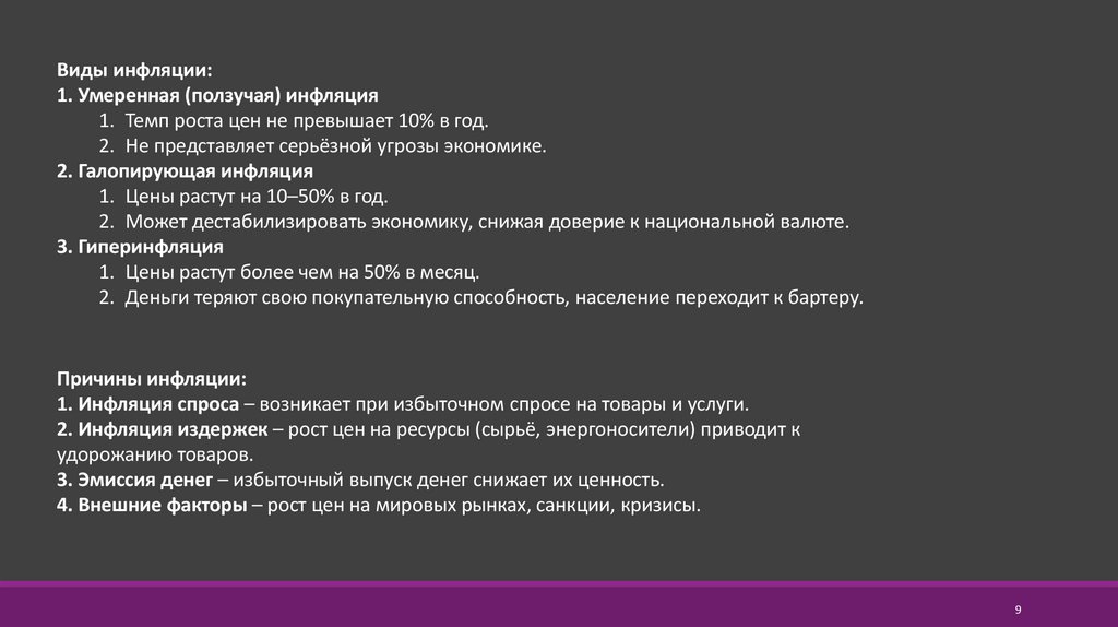 Виды инфляции:1. Умеренная (ползучая) инфляция