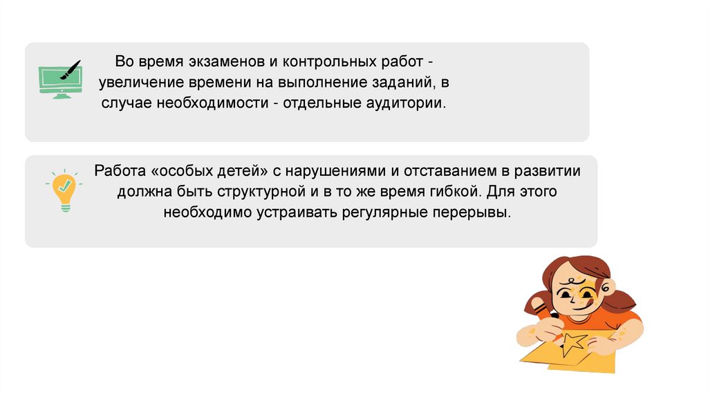 Во время экзаменов и контрольных работ увеличение времени на выполнение заданий, вслучае необходимости - отдельные аудитории.