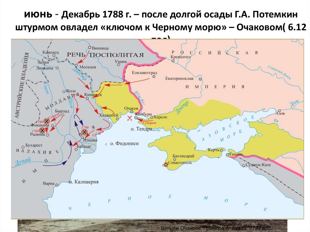 июнь - Декабрь 1788 г. – после долгой осады Г.А. Потемкинштурмом овладел «ключом к Черному морю» – Очаковом( 6.12