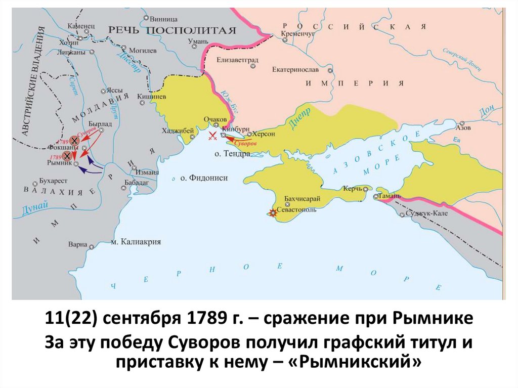 11(22) сентября 1789 г. – сражение при РымникеЗа эту победу Суворов получил графский титул и