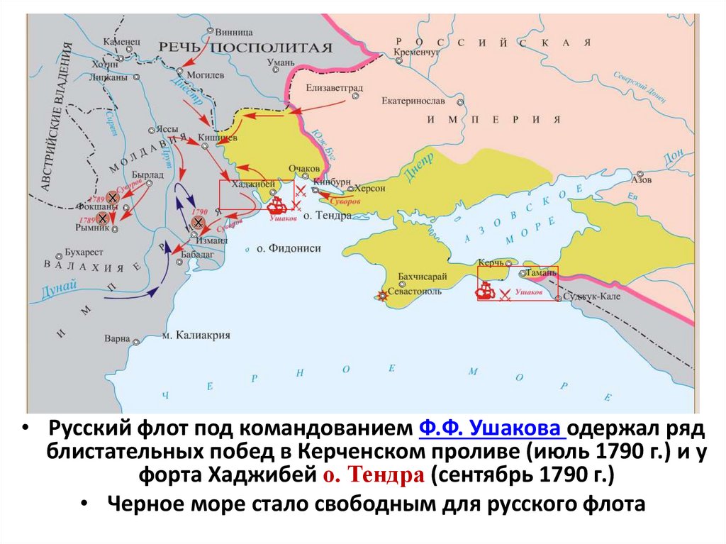 • Русский флот под командованием Ф.Ф. Ушакова одержал рядблистательных побед в Керченском проливе (июль 1790 г.) и у