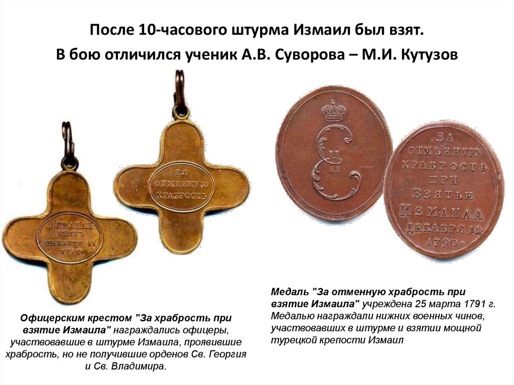 После 10-часового штурма Измаил был взят.В бою отличился ученик А.В. Суворова – М.И. Кутузов