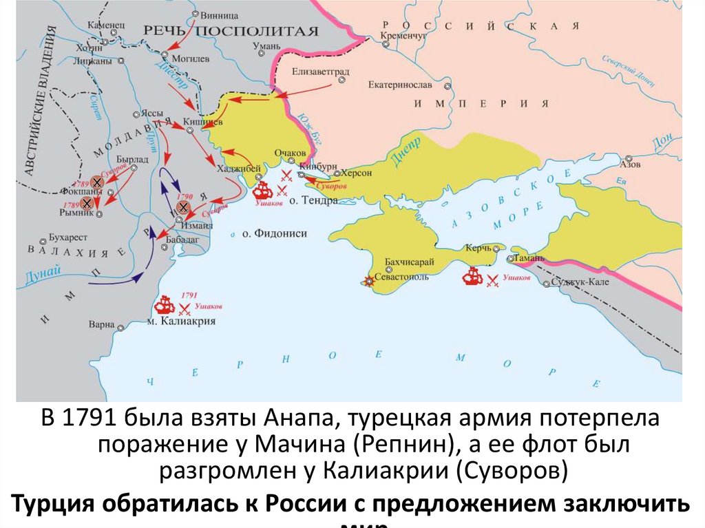 В 1791 была взяты Анапа, турецкая армия потерпелапоражение у Мачина (Репнин), а ее флот был