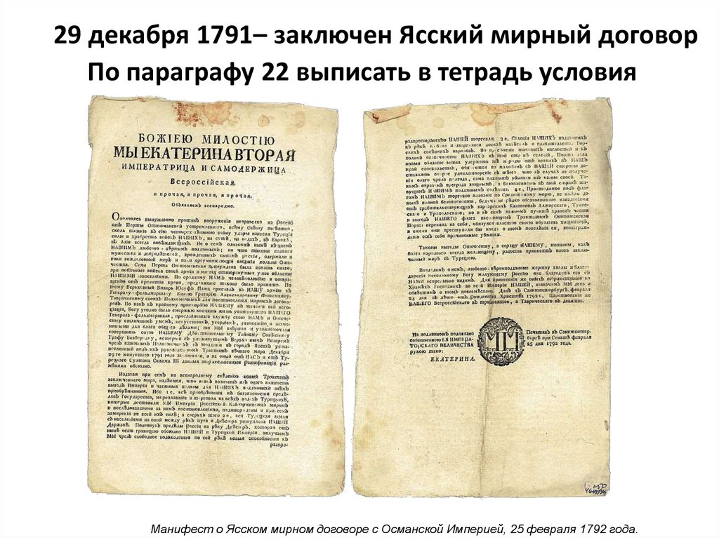 29 декабря 1791– заключен Ясский мирный договорПо параграфу 22 выписать в тетрадь условия