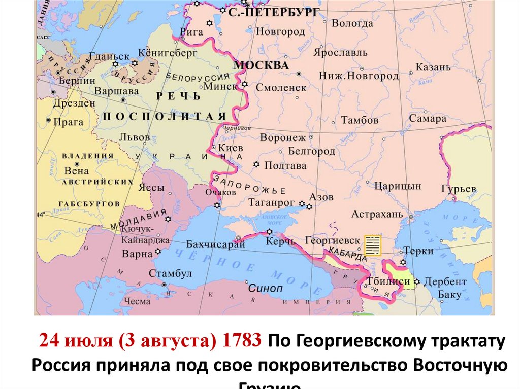 24 июля (3 августа) 1783 По Георгиевскому трактатуРоссия приняла под свое покровительство Восточную