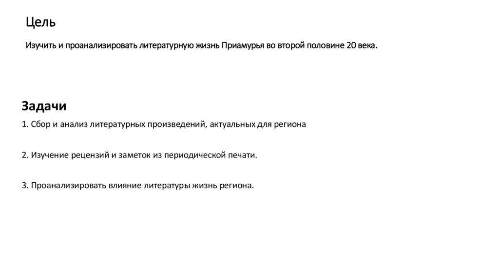 ЦельИзучить и проанализировать литературную жизнь Приамурья во второй половине 20 века.