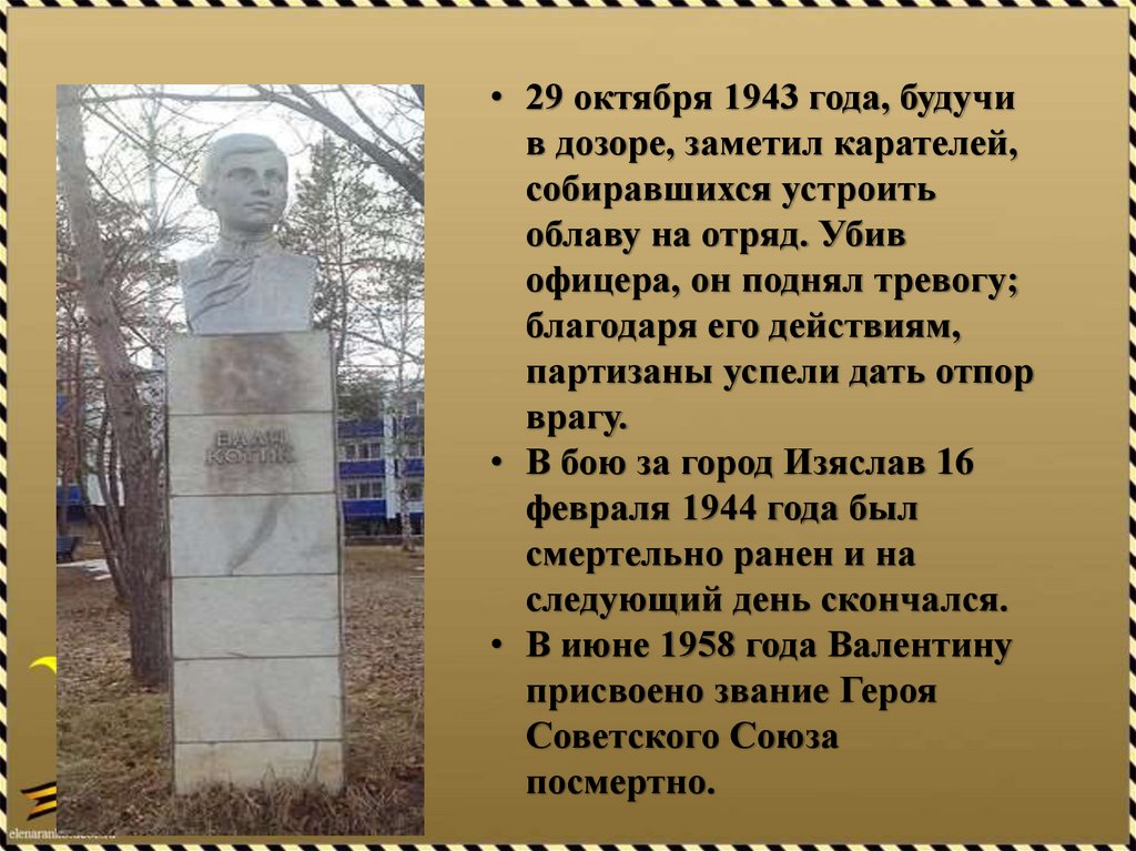 • 29 октября 1943 года, будучив дозоре, заметил карателей,