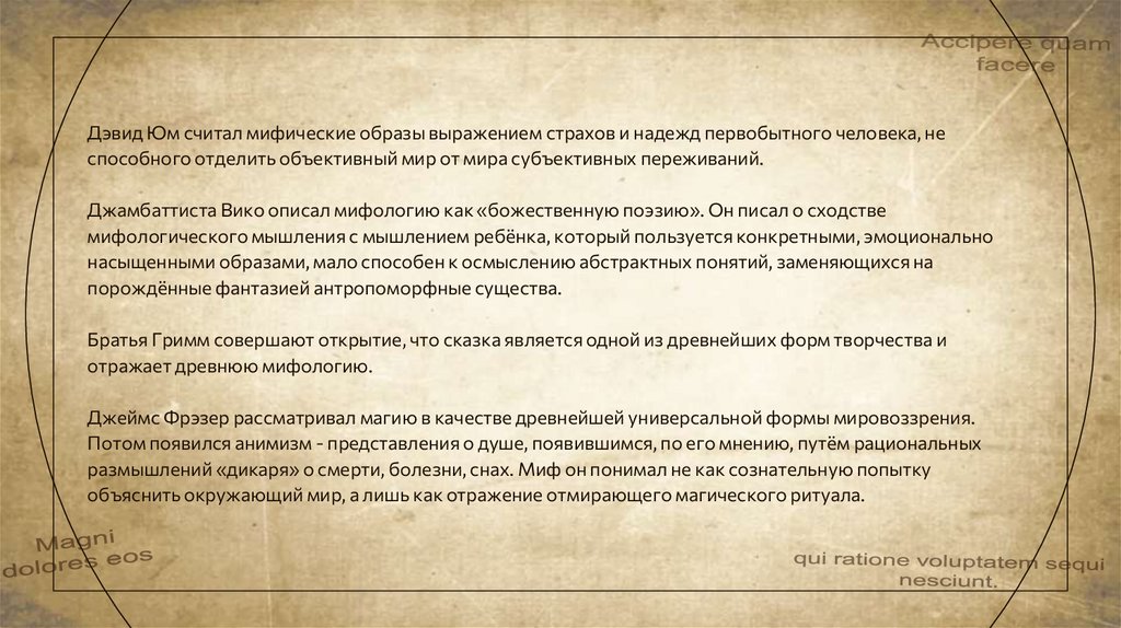 Дэвид Юм считал мифические образы выражением страхов и надежд первобытного человека, неспособного отделить объективный мир от мира субъективных переживаний.