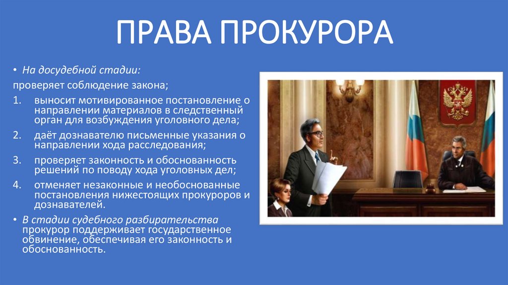 ПРАВА ПРОКУРОРА• На досудебной стадии: