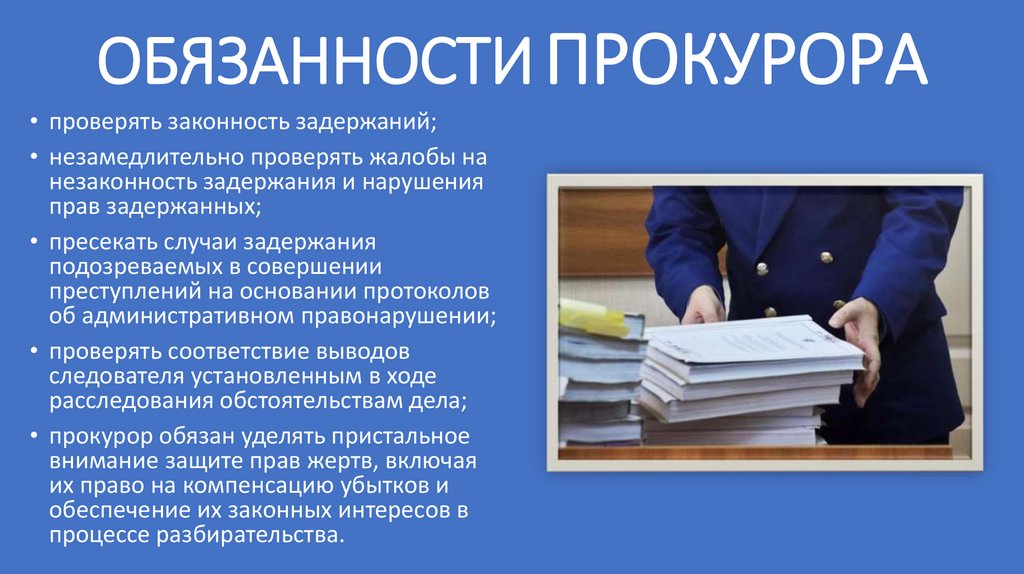 ОБЯЗАННОСТИ ПРОКУРОРА• проверять законность задержаний;