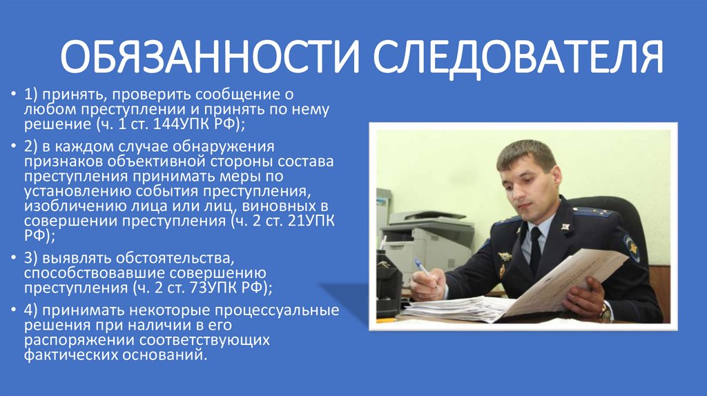 ОБЯЗАННОСТИ СЛЕДОВАТЕЛЯ• 1) принять, проверить сообщение о