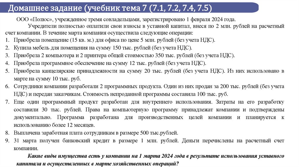 Домашнее задание (учебник тема 7 (7.1, 7.2, 7.4, 7.5)ООО «Полюс», учрежденное тремя совладельцами, зарегистрировано 1 февраля 2024 года.