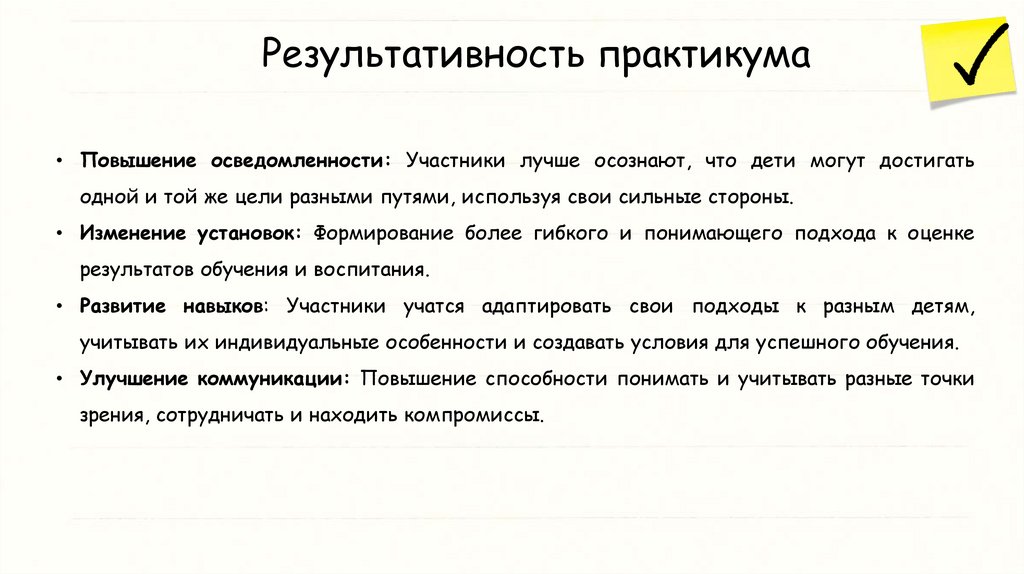Результативность практикума• Повышение осведомленности: Участники лучше осознают, что дети могут достигать