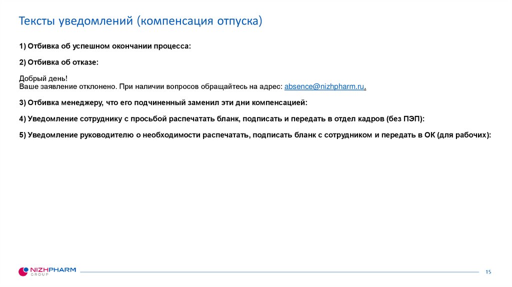 Тексты уведомлений (компенсация отпуска)1) Отбивка об успешном окончании процесса: