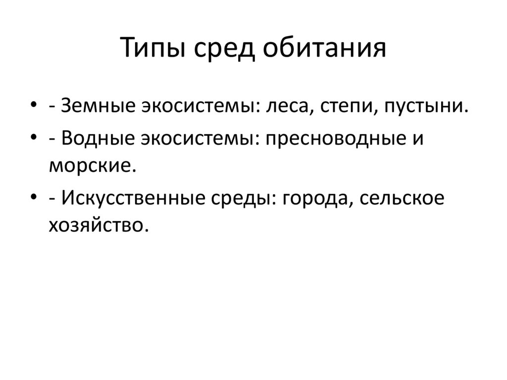 Типы сред обитания• - Земные экосистемы: леса, степи, пустыни.