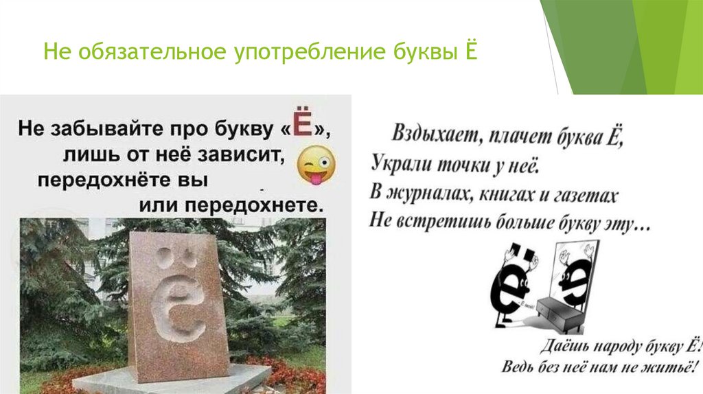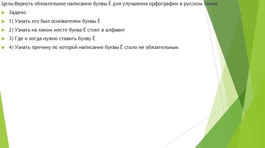 Цель:Вернуть обязательное написание буквы Ë для улучшения орфографии в русском языкеЗадачи: