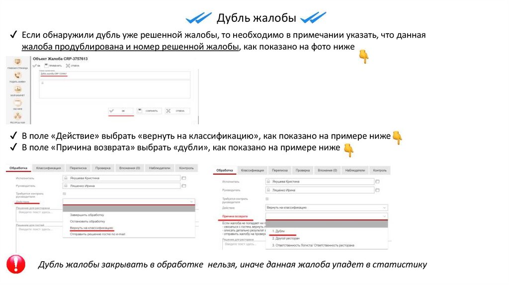 Дубль жалобы✔ Если обнаружили дубль уже решенной жалобы, то необходимо в примечании указать, что данная