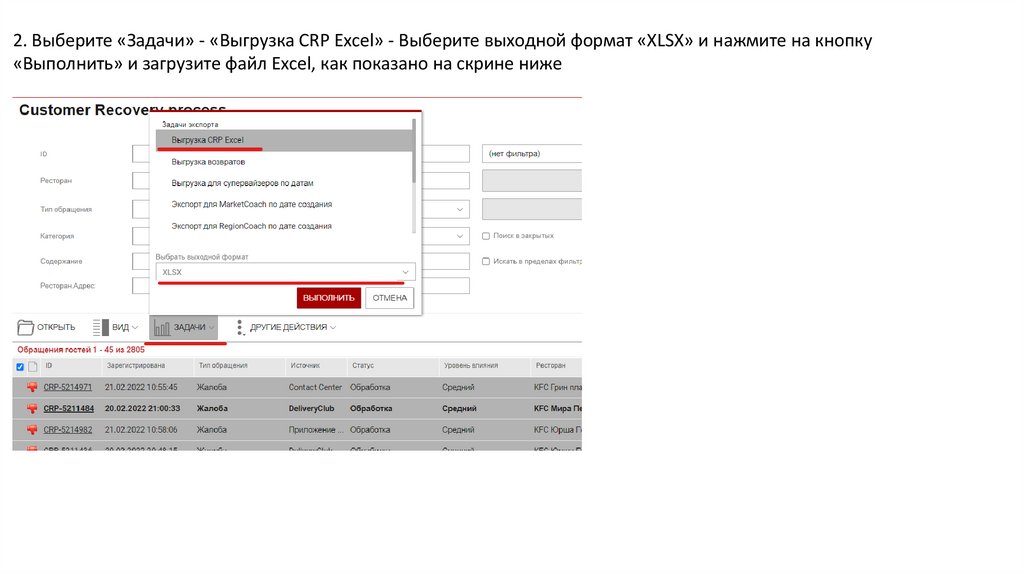 2. Выберите «Задачи» - «Выгрузка CRP Excel» - Выберите выходной формат «XLSX» и нажмите на кнопку«Выполнить» и загрузите файл Excel, как показано на скрине ниже
