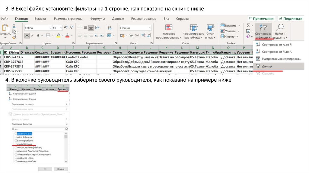 3. В Excel файле установите фильтры на 1 строчке, как показано на скрине ниже4. В колонке руководитель выберите своего руководителя, как показано на примере ниже