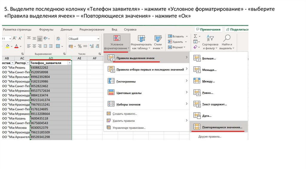 5. Выделите последнюю колонку «Телефон заявителя» - нажмите «Условное форматрирование» - «выберите«Правила выделения ячеек» – «Повторяющиеся значения» - нажмите «Ок»