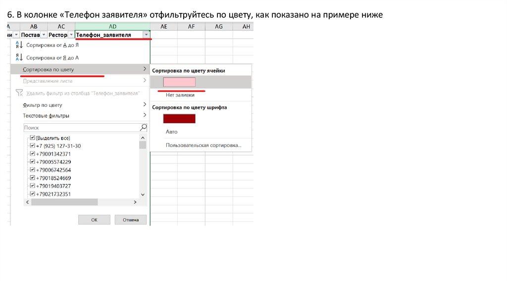 6. В колонке «Телефон заявителя» отфильтруйтесь по цвету, как показано на примере ниже17.