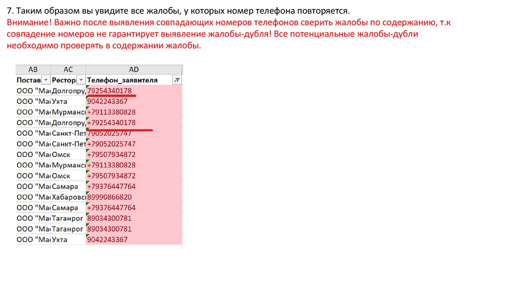 7. Таким образом вы увидите все жалобы, у которых номер телефона повторяется.Внимание! Важно после выявления совпадающих номеров телефонов сверить жалобы по содержанию, т.к