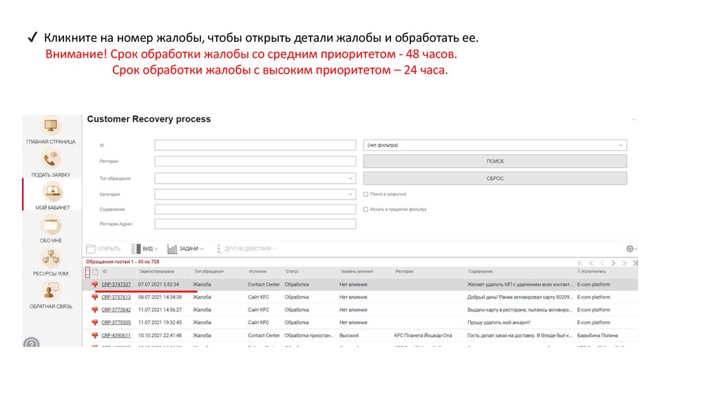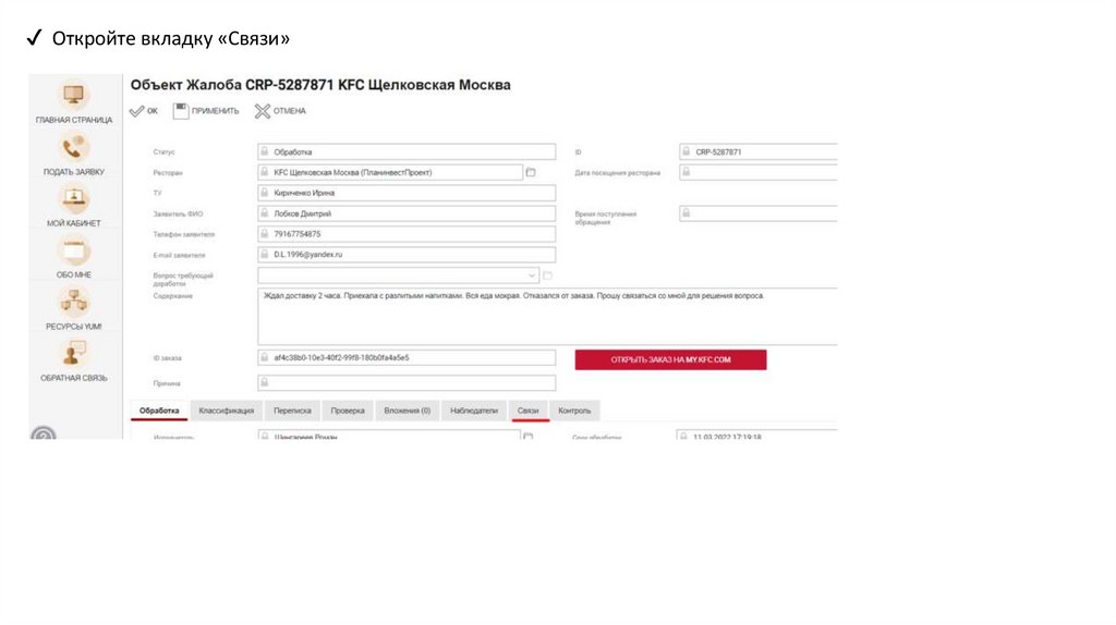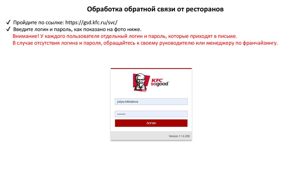Обработка обратной связи от ресторанов✔ Пройдите по ссылке: https://gsd.kfc.ru/svc/