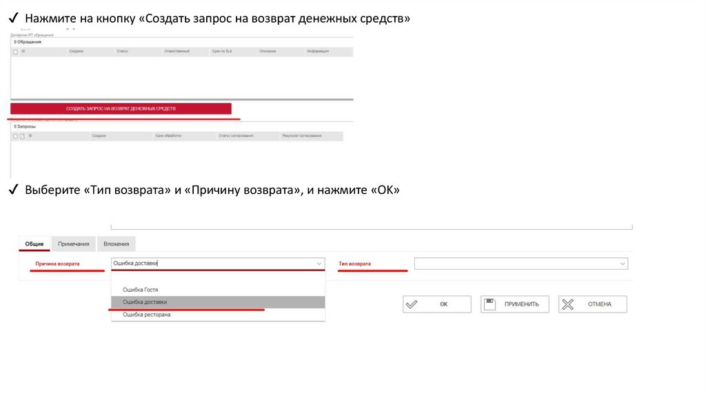 ✔ Нажмите на кнопку «Создать запрос на возврат денежных средств»✔ Выберите «Тип возврата» и «Причину возврата», и нажмите «OK»