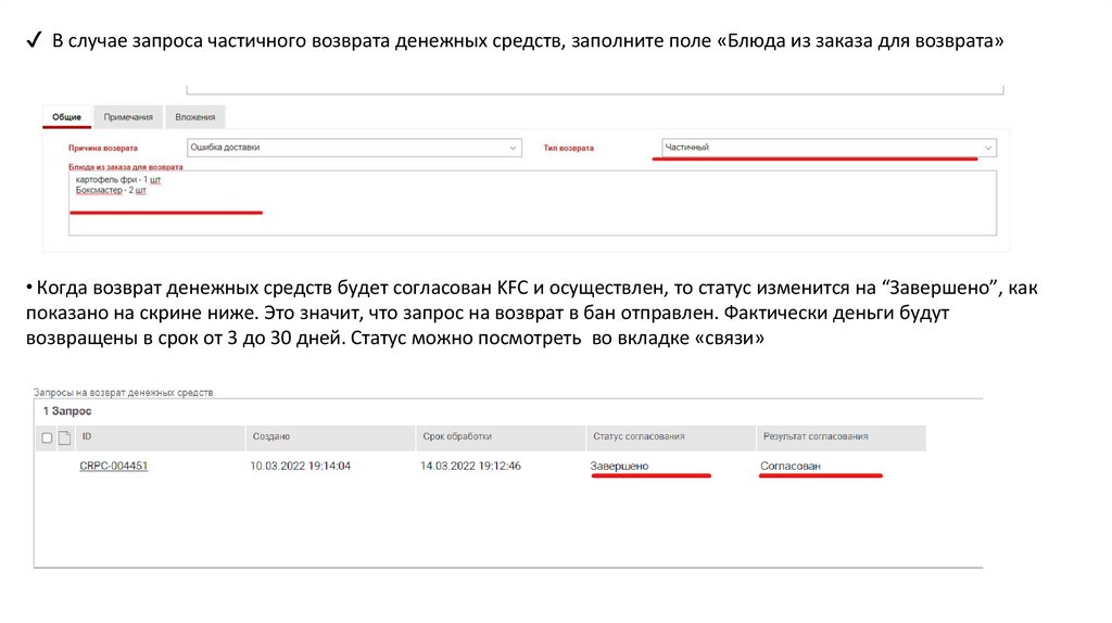 ✔ В случае запроса частичного возврата денежных средств, заполните поле «Блюда из заказа для возврата»• Когда возврат денежных средств будет согласован KFC и осуществлен, то статус изменится на “Завершено”, как