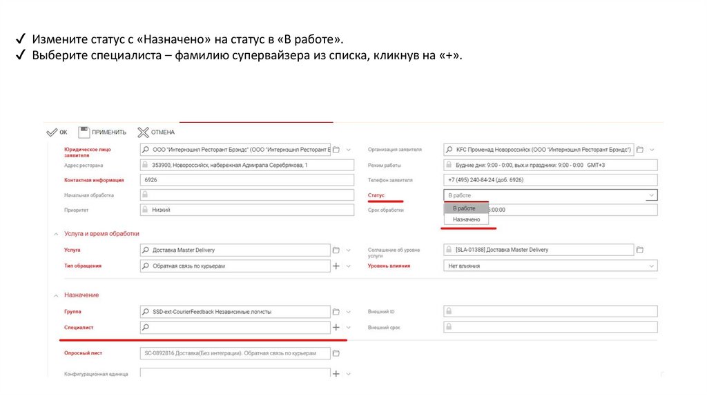 ✔ Измените статус с «Назначено» на статус в «В работе».✔ Выберите специалиста – фамилию супервайзера из списка, кликнув на «+».