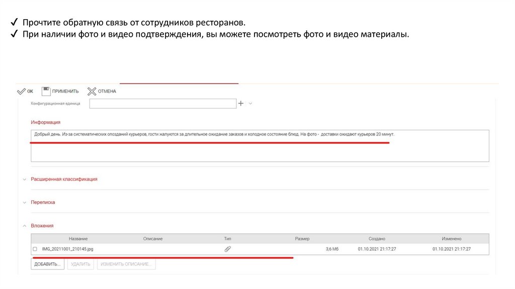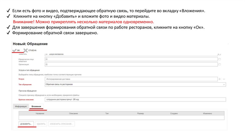 ✔ Если есть фото и видео, подтверждающее обратную связь, то перейдите во вкладку «Вложения».✔ Кликните на кнопку «Добавить» и вложите фото и видео материалы.