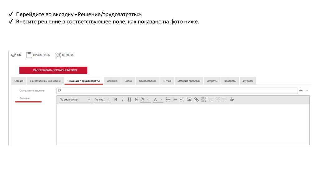 ✔ Перейдите во вкладку «Решение/трудозатраты».✔ Внесите решение в соответствующее поле, как показано на фото ниже.