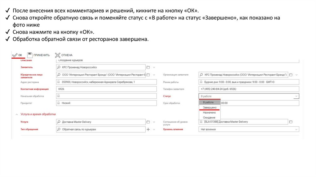 ✔ После внесения всех комментариев и решений, кикните на кнопку «ОК».✔ Снова откройте обратную связь и поменяйте статус с «В работе» на статус «Завершено», как показано на