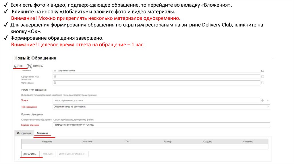 ✔ Если есть фото и видео, подтверждающее обращение, то перейдите во вкладку «Вложения».✔ Кликните на кнопку «Добавить» и вложите фото и видео материалы.