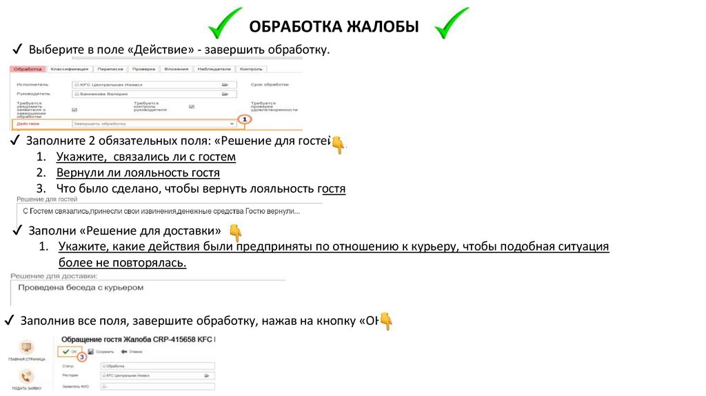ОБРАБОТКА ЖАЛОБЫ✔ Выберите в поле «Действие» - завершить обработку.