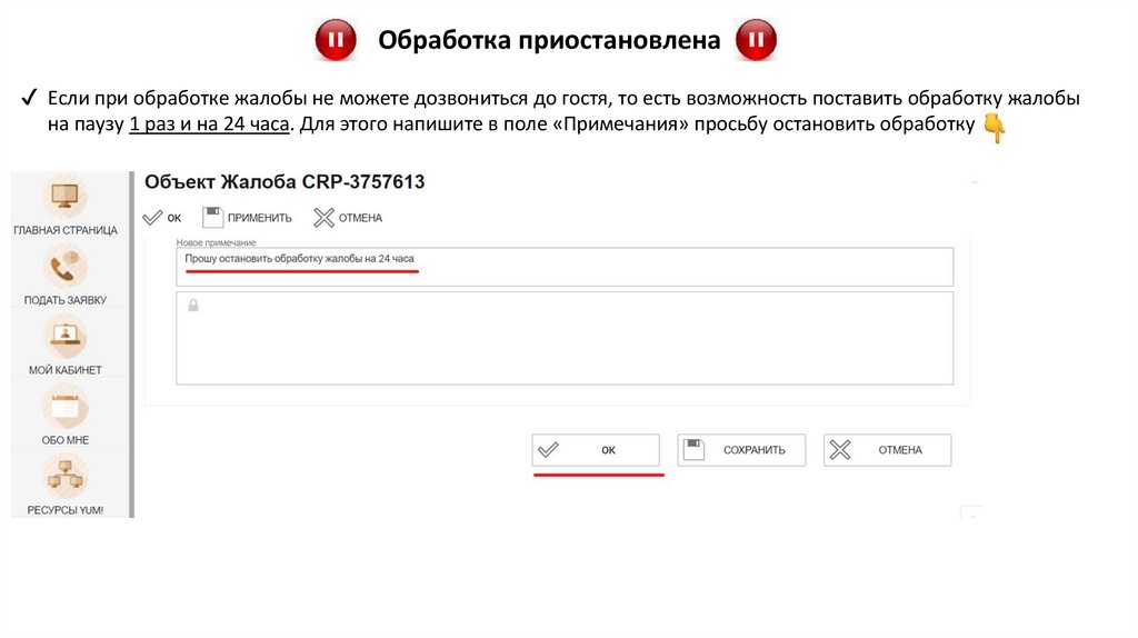 Обработка приостановлена✔ Если при обработке жалобы не можете дозвониться до гостя, то есть возможность поставить обработку жалобы