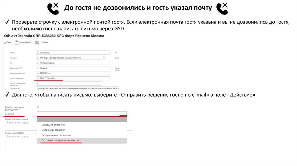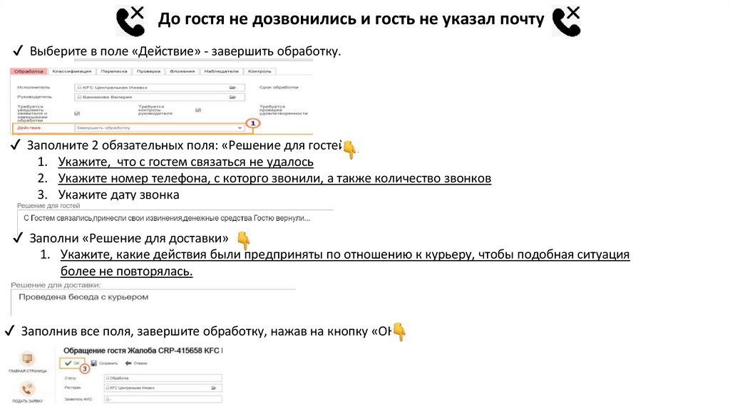 До гостя не дозвонились и гость не указал почту✔ Выберите в поле «Действие» - завершить обработку.
