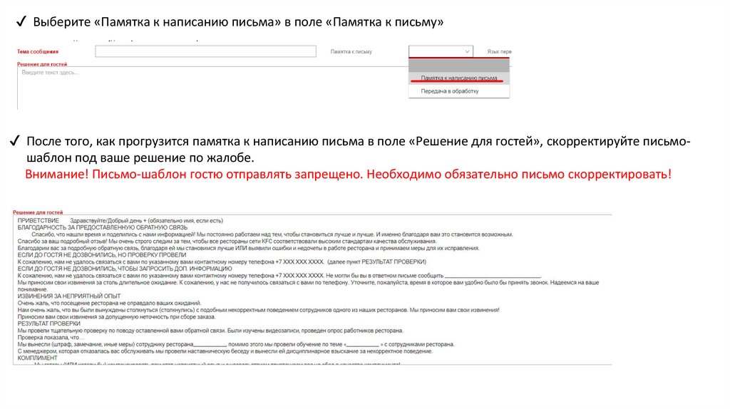 ✔ Выберите «Памятка к написанию письма» в поле «Памятка к письму»✔ После того, как прогрузится памятка к написанию письма в поле «Решение для гостей», скорректируйте письмошаблон под ваше решение по жалобе.