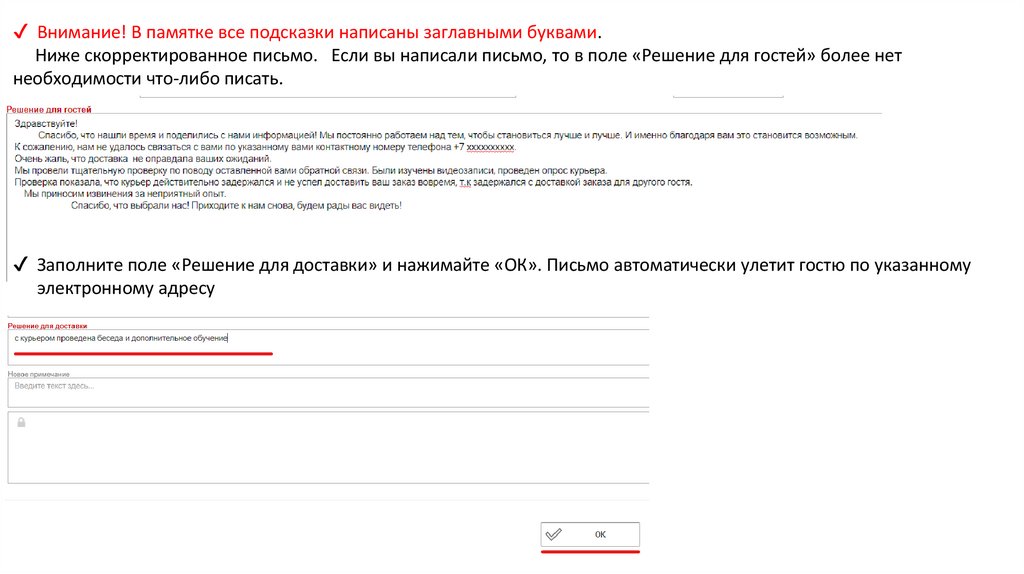 ✔ Заполните поле «Решение для доставки» и нажимайте «ОК». Письмо автоматически улетит гостю по указанному