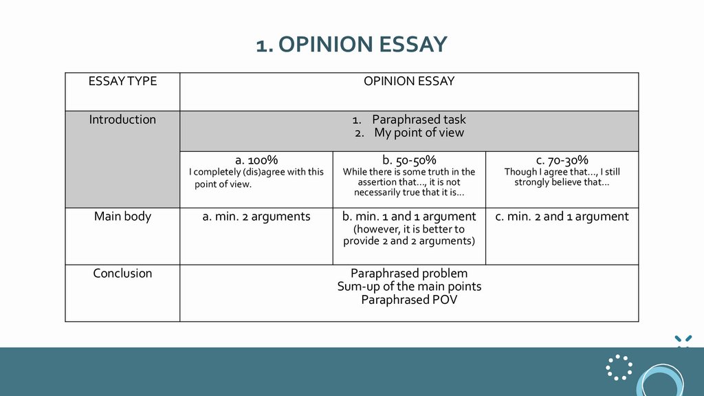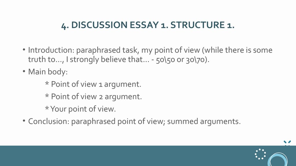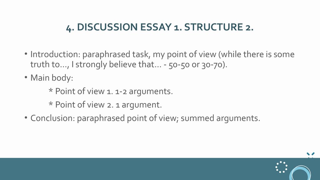 4. DISCUSSION ESSAY 1. STRUCTURE 1.• Introduction: paraphrased task, my point of view (while there is some