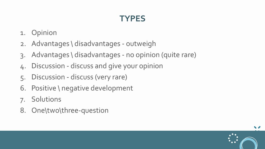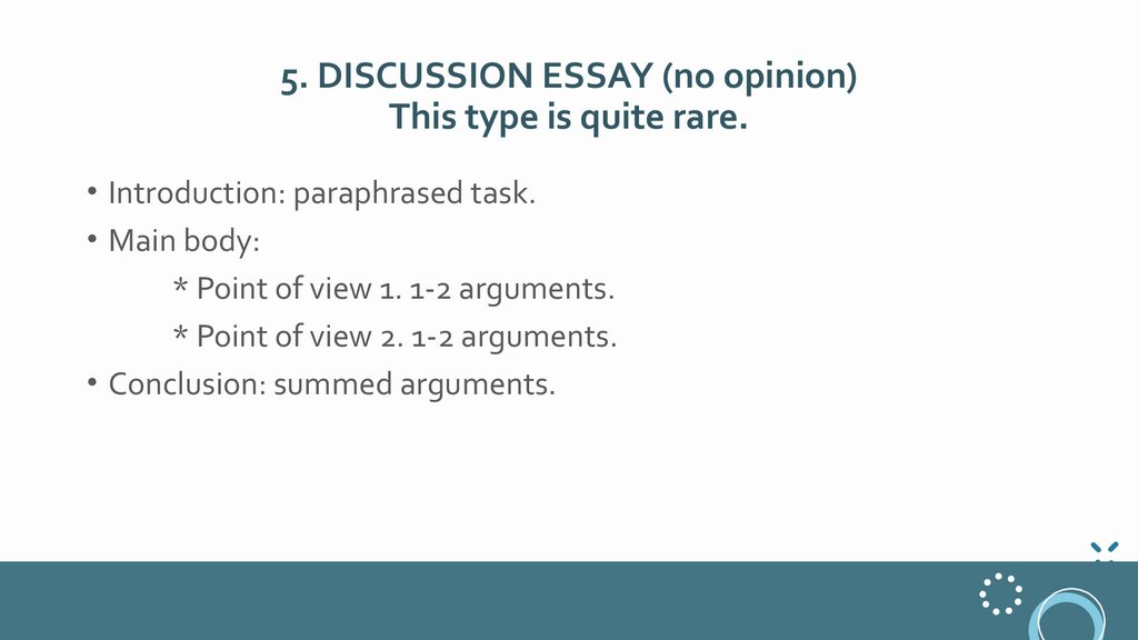 5. DISCUSSION ESSAY (no opinion)This type is quite rare.