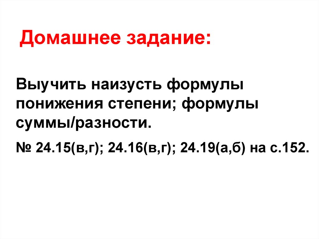 Выучить наизусть формулыпонижения степени; формулы