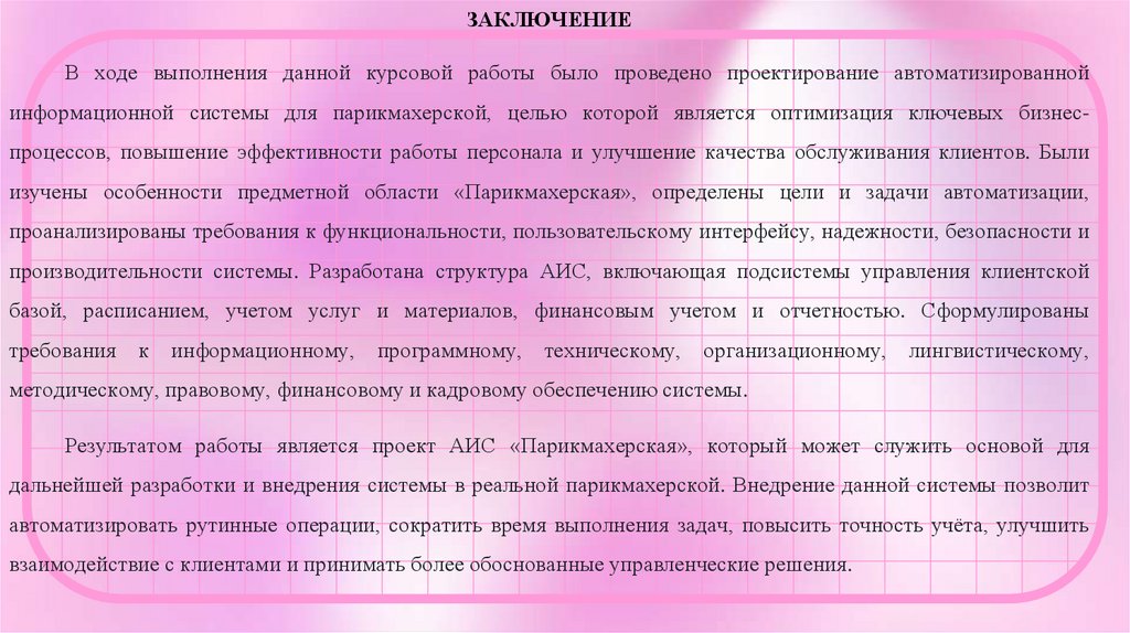 Результатом работы является проект АИС «Парикмахерская», который может служить основой для