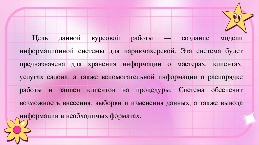 информационной системы для парикмахерской, целью которой является оптимизация ключевых бизнеспроцессов, повышение эффективности работы персонала и улучшение качества обслуживания клиентов. Были