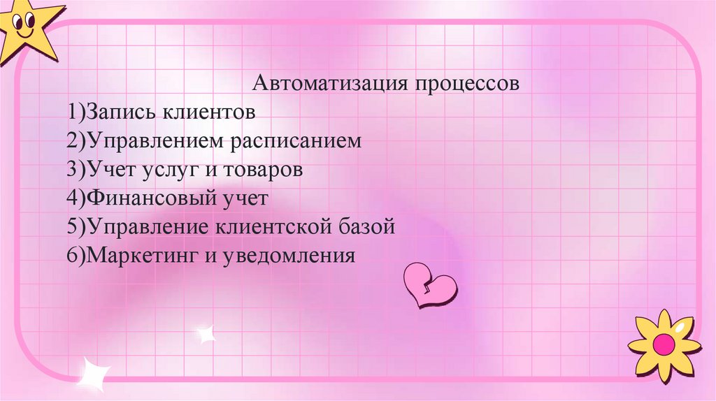 базой, расписанием, учетом услуг и материалов, финансовым учетом и отчетностью. Сформулированы