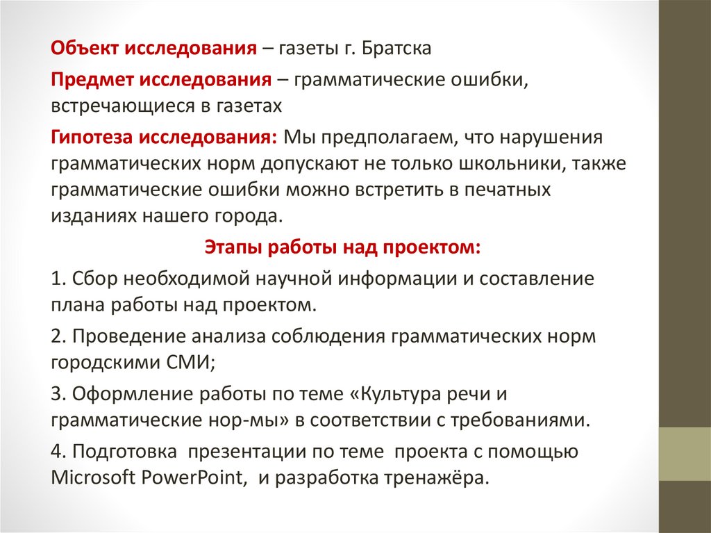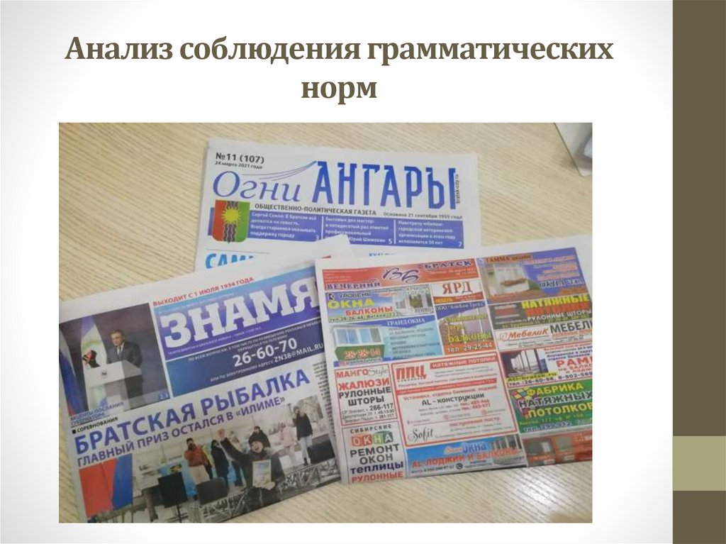 Объект исследования – газеты г. БратскаПредмет исследования – грамматические ошибки,