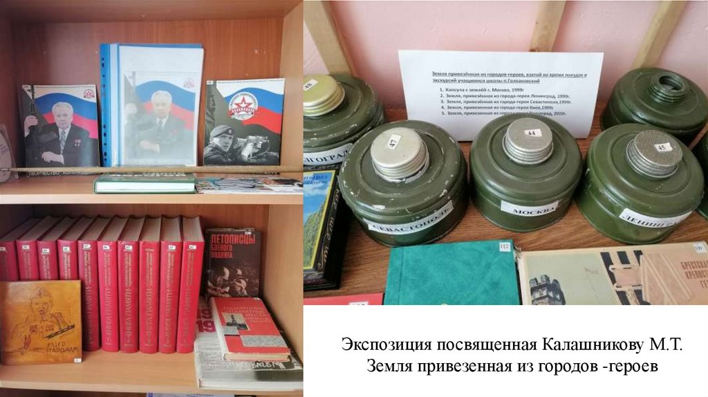 Экспозиция посвященная Калашникову М.Т.Земля привезенная из городов -героев
