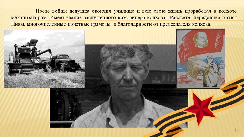 После войны дедушка окончил училище и всю свою жизнь проработал в колхоземеханизатором. Имеет звание заслуженного комбайнера колхоза «Рассвет», передовика жатвы