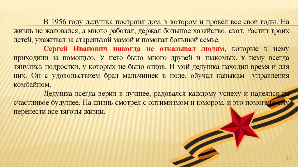 В 1956 году дедушка построил дом, в котором и провёл все свои годы. Нажизнь не жаловался, а много работал, держал большое хозяйство, скот. Растил троих