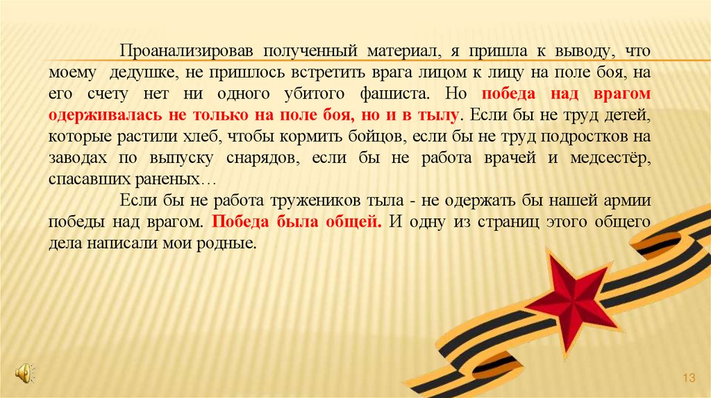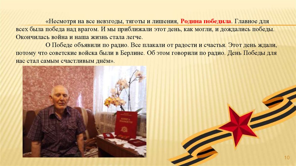 «Несмотря на все невзгоды, тяготы и лишения, Родина победила. Главное длявсех была победа над врагом. И мы приближали этот день, как могли, и дождались победы.